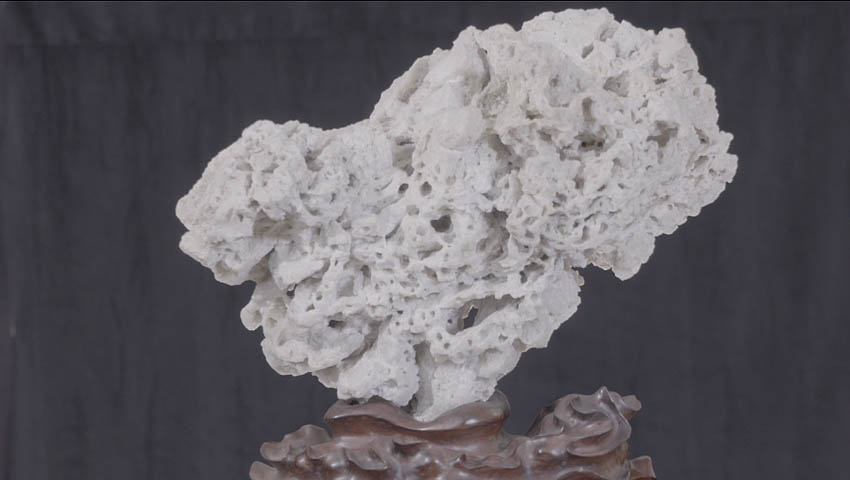 \n 太湖石形状险怪、千窍百孔。北宋时,以“石痴”著称的米芾提出了以皱、瘦、透、漏四字作为太湖石的评鉴标准。也就是说,石的表面要高低参差,要多褶皱,外形轮廓宜跌宕突兀,石体宜瘦秀苗条,宜透漏交错,窝洞相套。这一标准几乎成为我国传统赏石理论的基础。 \n