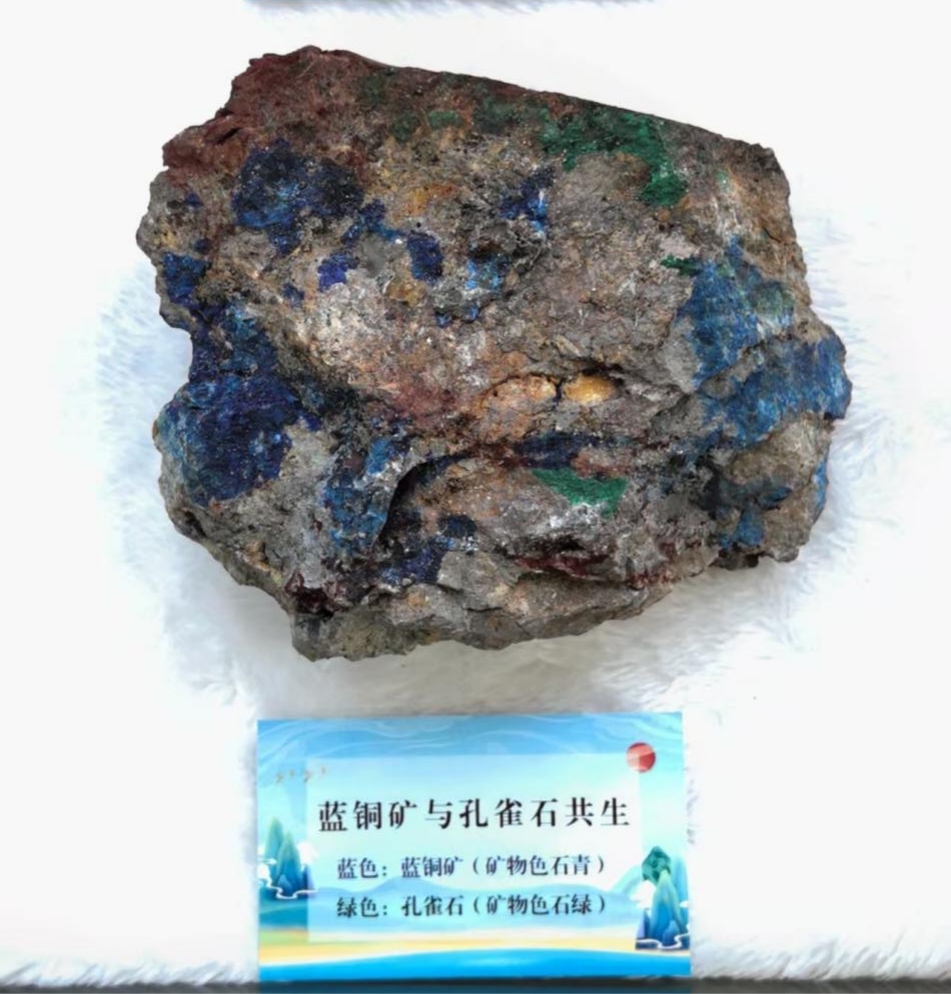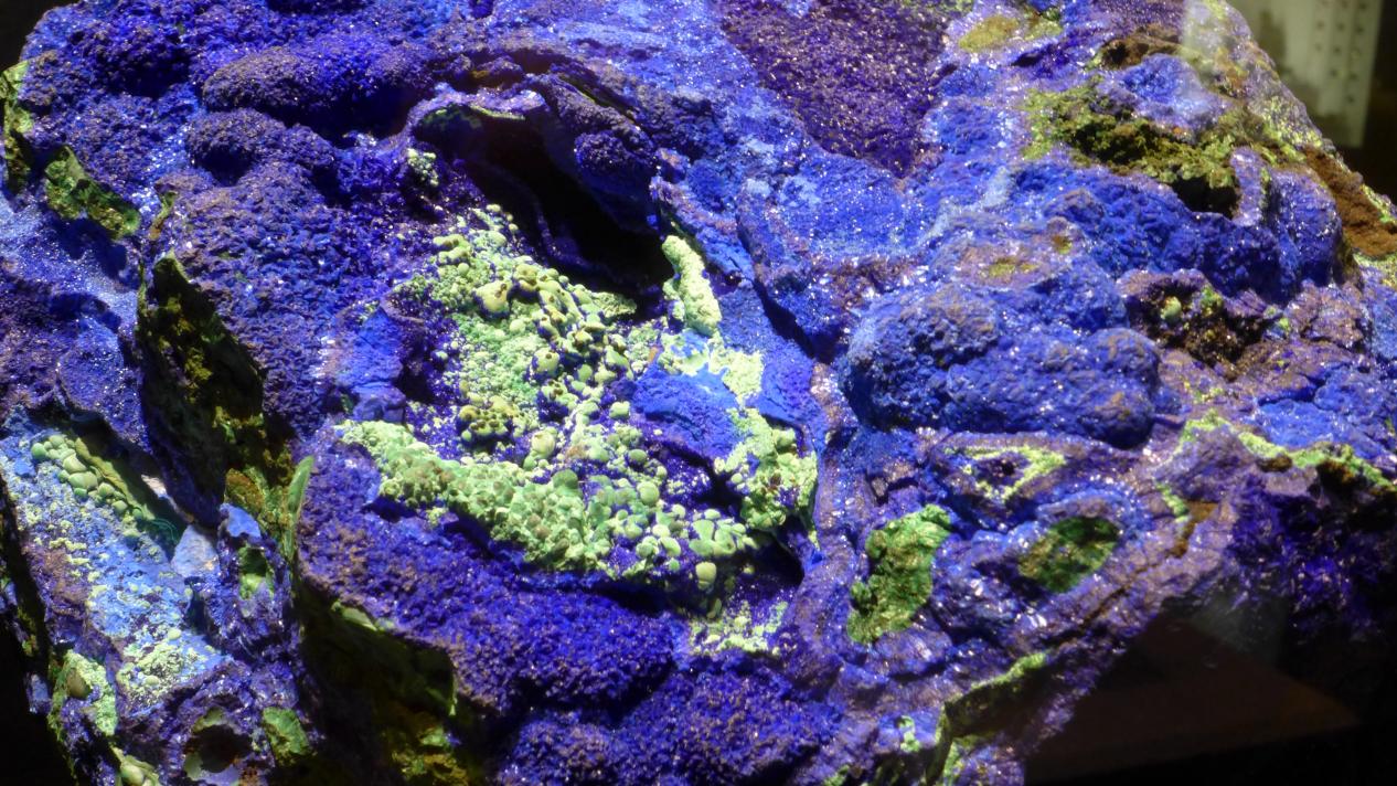 说到蓝铜矿,就不得不提它的“姐妹矿物”——孔雀石,即石绿。蓝铜矿和孔雀石同为孔雀石族矿物,它们二者是成分相似、晶体结构相同的类质同象,古今都有“青绿同矿”的说法,说的正是它们在野外常常共生,并且在特定的条件下可以互相转换。